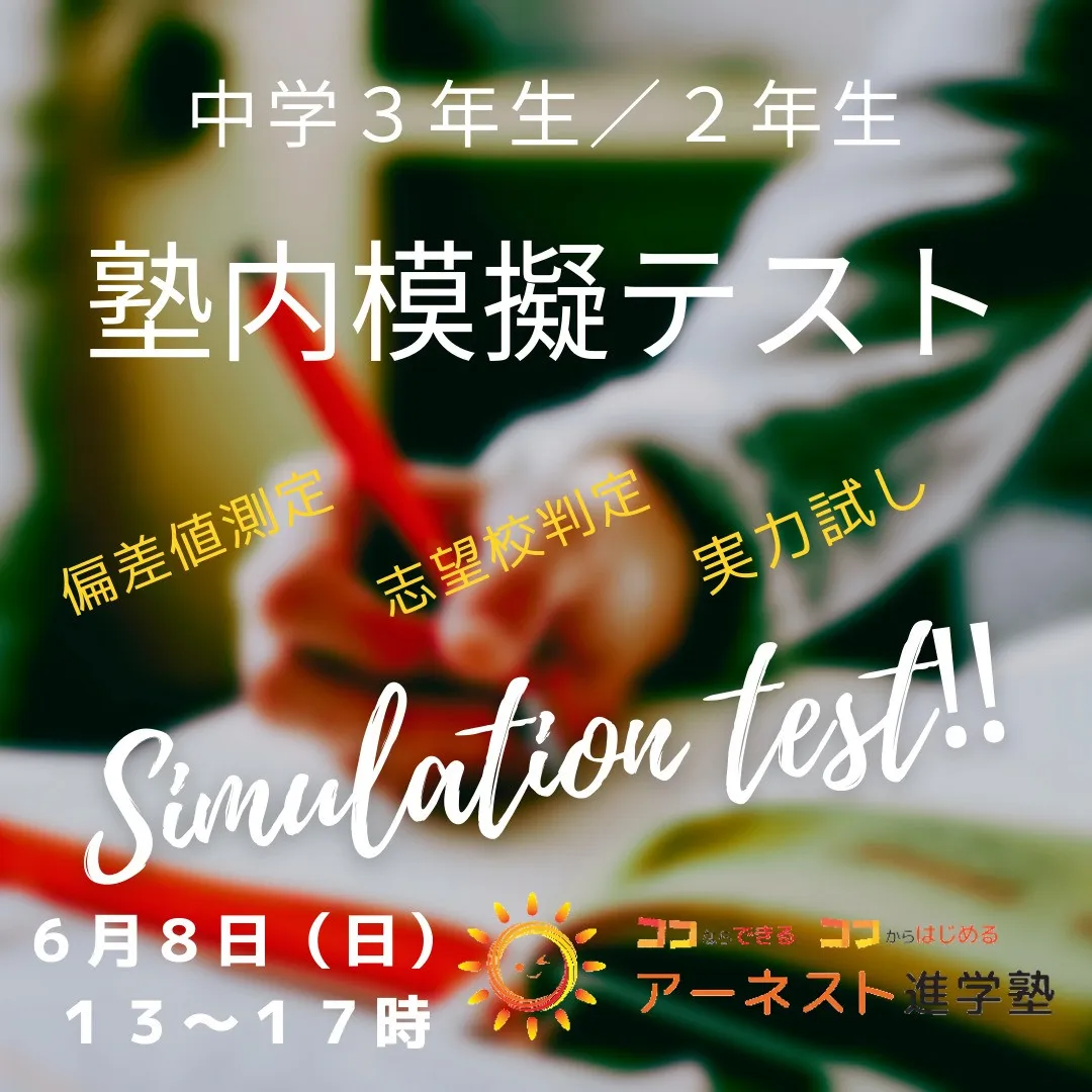 アーネスト進学塾亀岡教室では、6月8日(日)に塾内模擬テスト... アーネスト進学塾亀岡教室では、6月8日(日)に塾内模擬テストを行います!📚✏️受験生の皆さん、勉強の進捗を確認する絶好のチャンスですよ!模擬テストは、自分の実力をしっかり把握するための重要なス…