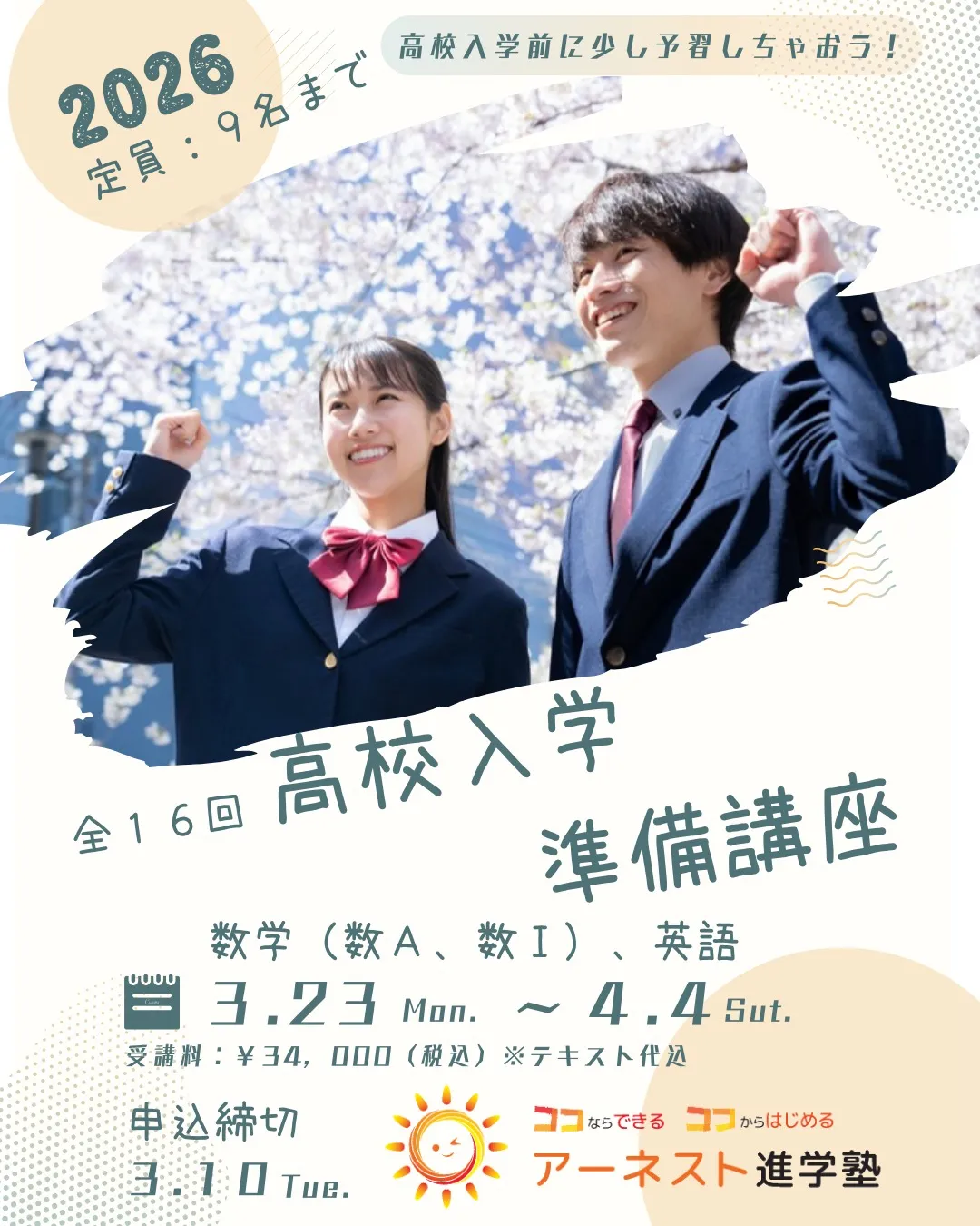 春期講習のお知らせ 新学年、スタートに乗り遅れるな!!アーネスト進学塾では、3/24(月)~4/8(火)まで、春期講習を開講いたします。新中1:国・数・英3教科コース新中2:国・数・英3教科コース新中3:国・…